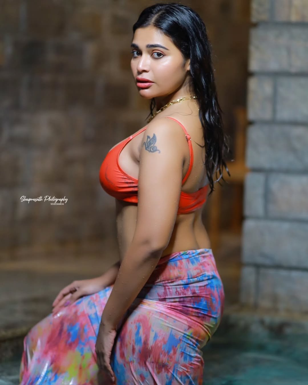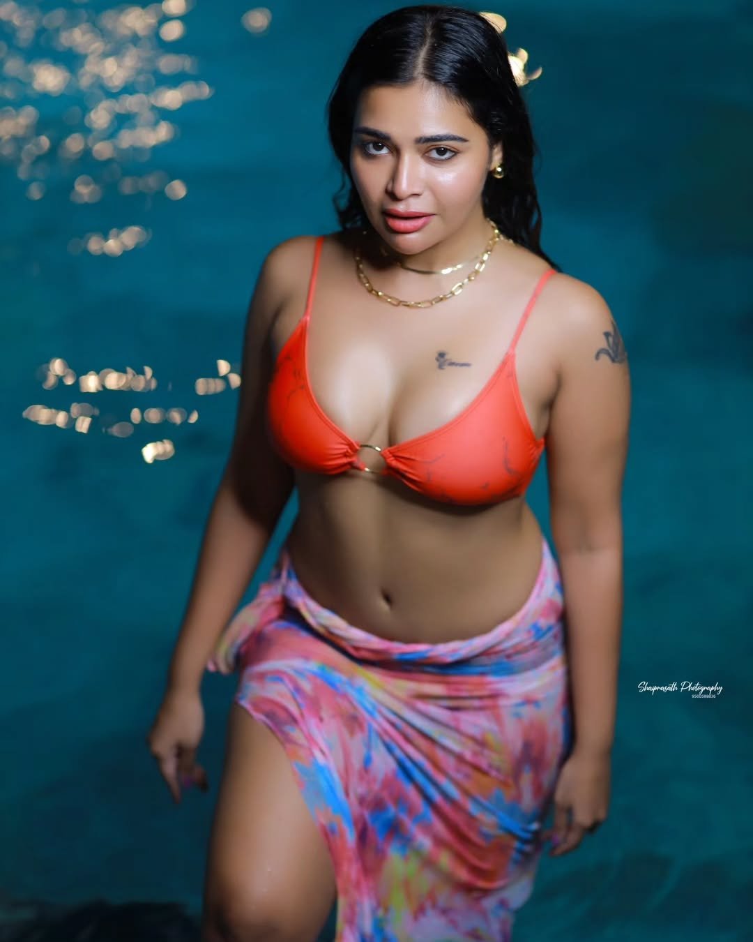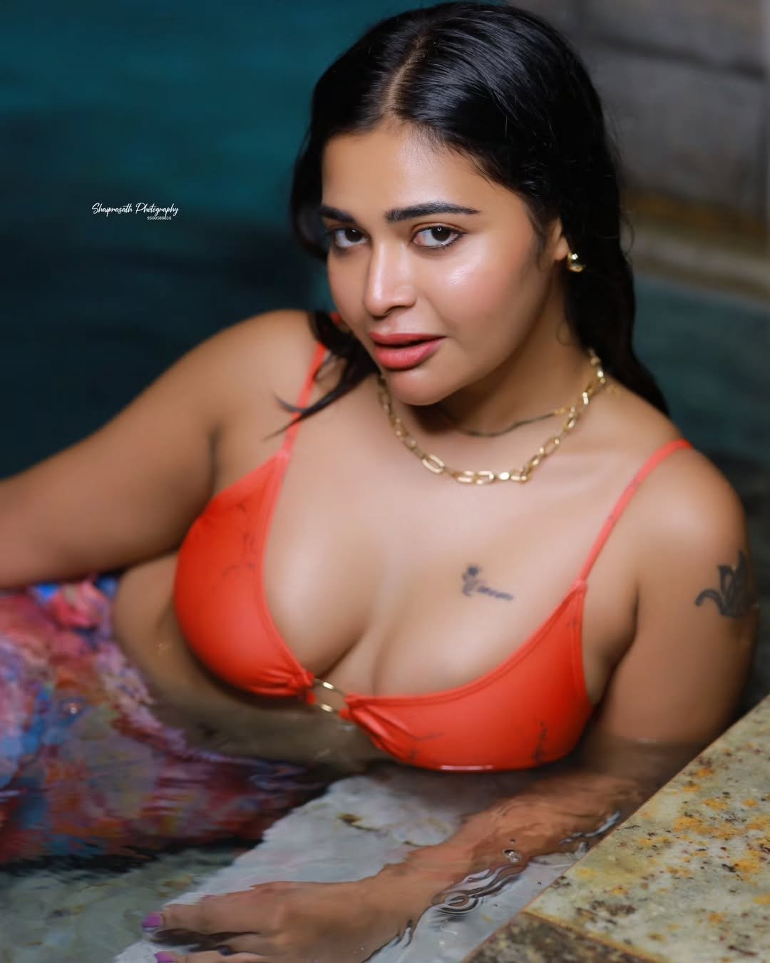 In these stunning poolside visuals, the woman the user identifies as Sanam Shetty steps into the frame with a mood that’s equal parts confidence, glamour, and cinematic sensuality. Known for her performances in films like Dagalty, Sadhuram 2, Magizh Thirumeni’s psychological thriller projects, and her Tamil/Telugu appearances across the years, she brings the same screen presence here — but with a bold, modern edge.