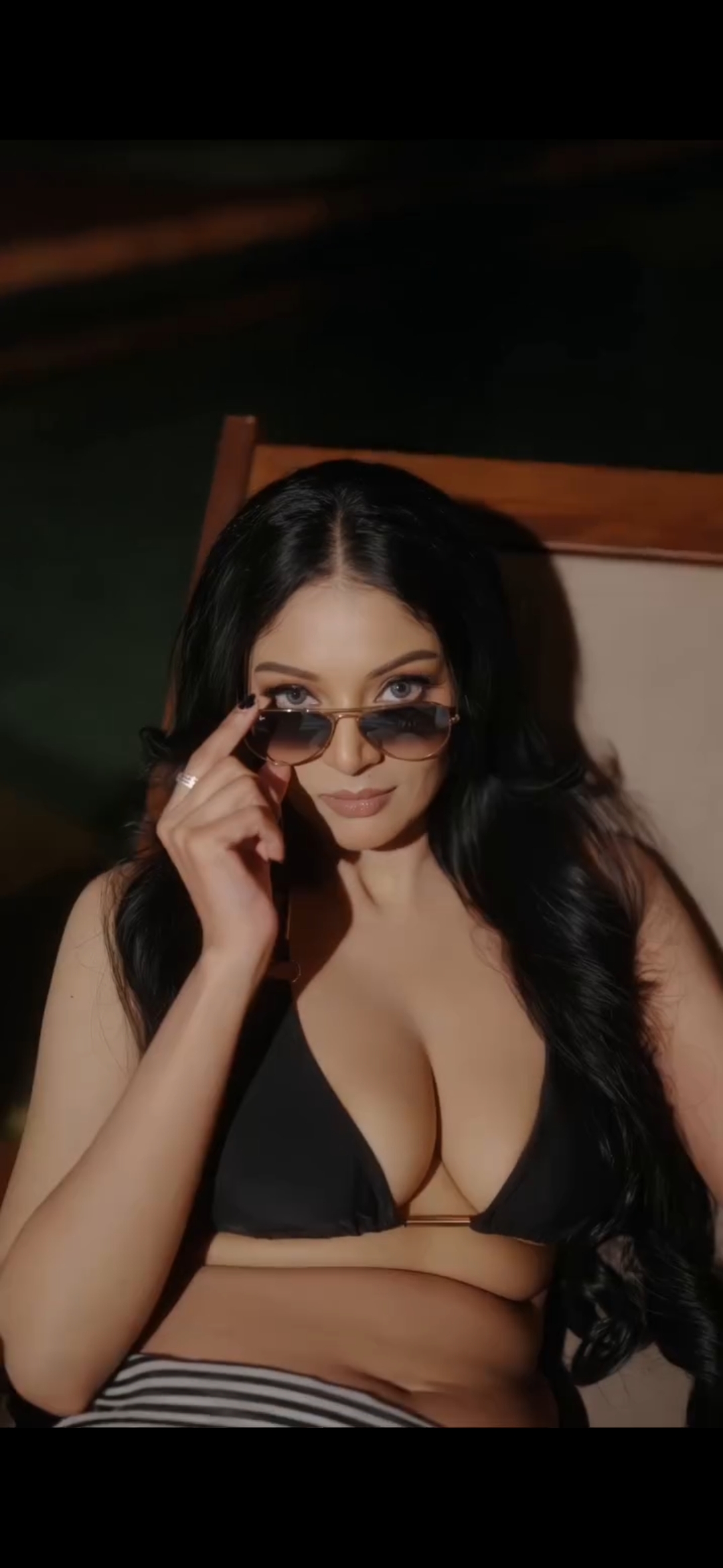 Paired with it is a striped sarong, draped asymmetrically around her waist. The soft pastel tones — blush pink, muted grey, and charcoal — contrast beautifully against the deep black bikini, giving the outfit a playful yet sensual rhythm. The drape highlights her curves, especially her toned midriff and long, graceful legs, creating a look that’s flirtatious without being loud, stylish without being excessive.