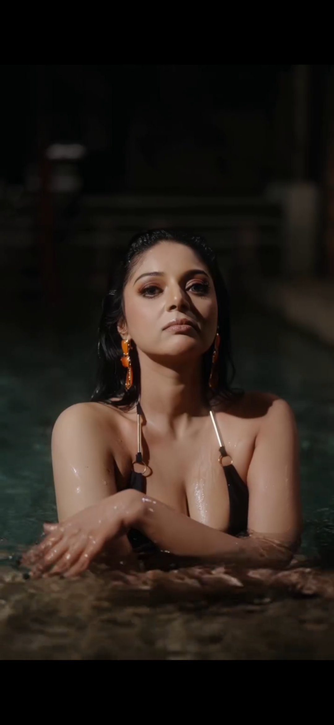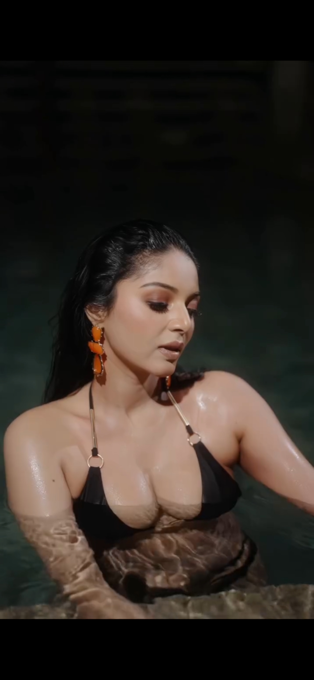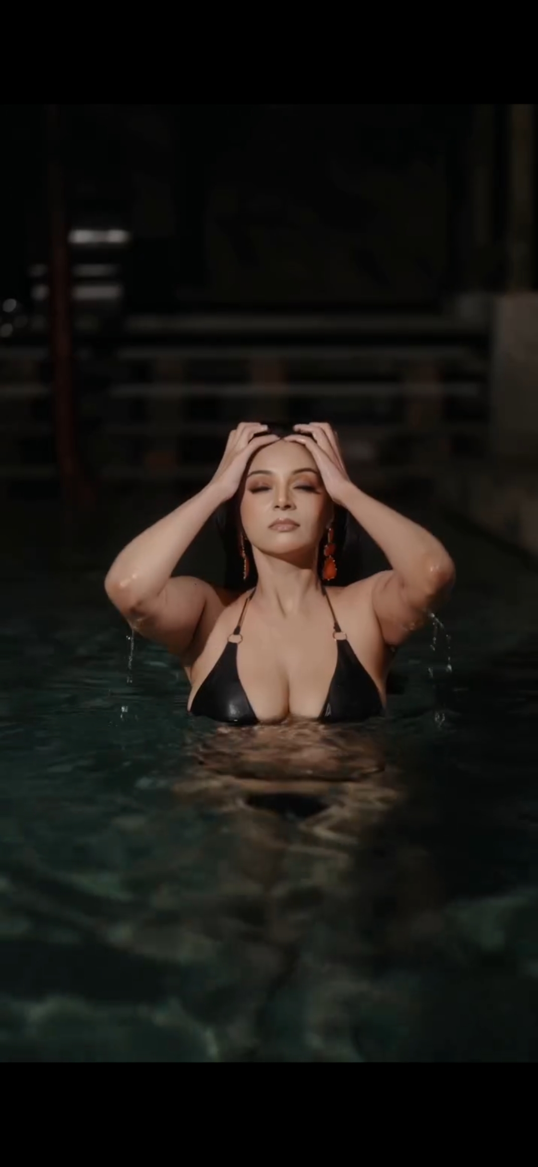 In the close-up, emerging from the water, her skin glows with a soft sheen, giving her an irresistible, wet-glamour finish. Her eyes — accentuated by bold eyeliner and smudged, smoky tones — lock straight onto the camera with controlled intensity. The subtle pout, the slight tilt of her chin, the water-traced collarbone… every detail adds to that elite, glossy-magazine charisma.