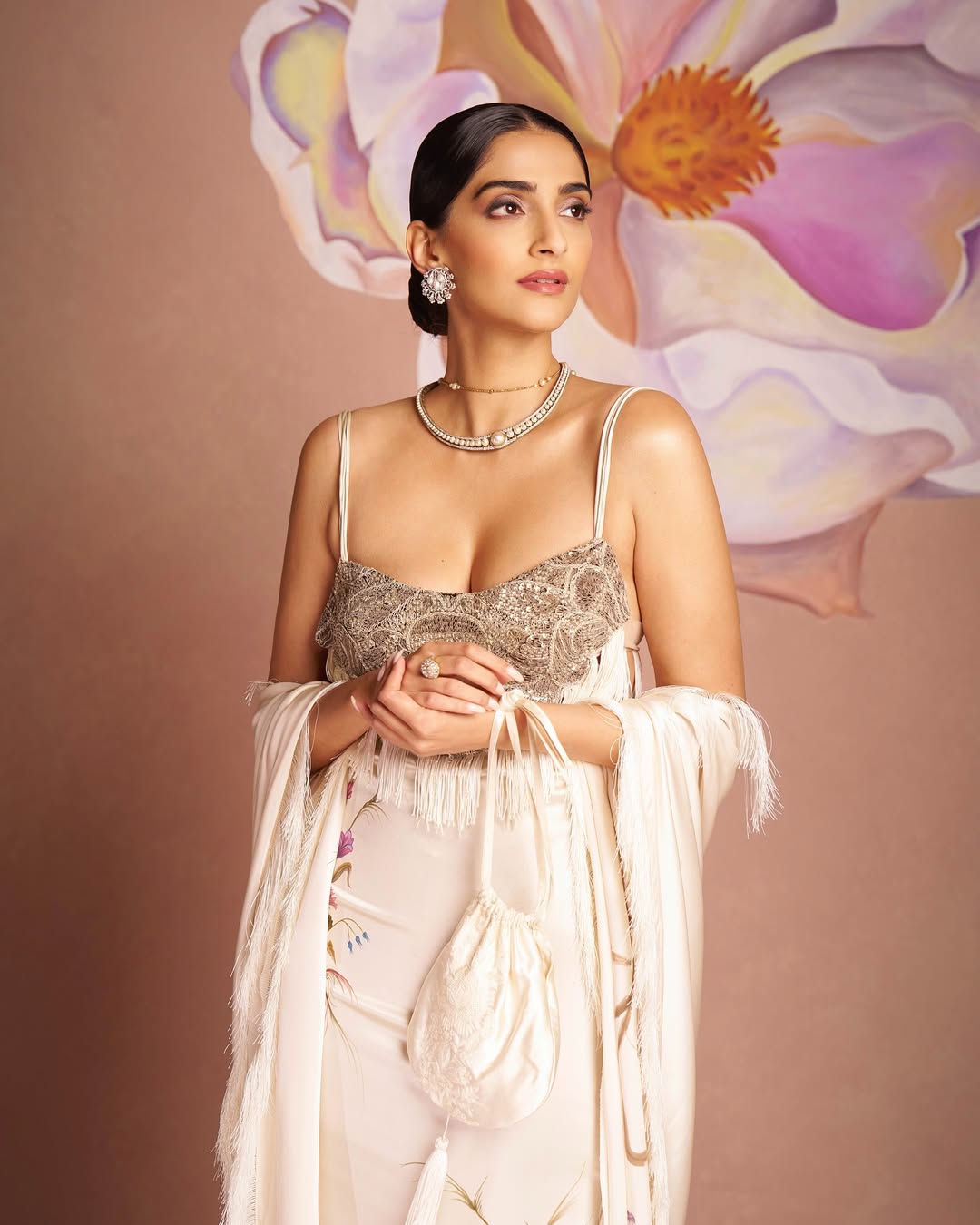 Her accessories—statement earrings, a delicate necklace, and a vintage-style pearl clutch—enhance the regal charm of her look. The fringed detailing on her outfit adds a touch of old-world glamour, reminiscent of the golden era of fashion. Her sleek, pulled-back hairstyle allows her sharp features to take center stage, with her luminous skin and perfectly sculpted brows adding to her poised appearance.