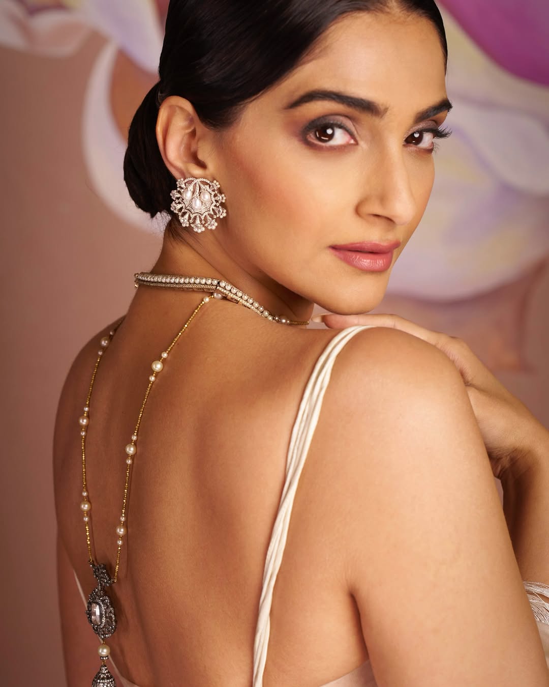 Draped in a delicate ensemble that exudes luxury and grace, Sonam Kapoor looks every bit the ethereal goddess. Her outfit, a stunning mix of opulence and sophistication, highlights her statuesque frame and radiant presence. The fitted bodice, adorned with intricate embellishments, accentuates her slender figure, while the flowing drapes of the ensemble create an aura of effortless elegance. The soft, pastel hues complement her glowing complexion, adding to her allure.