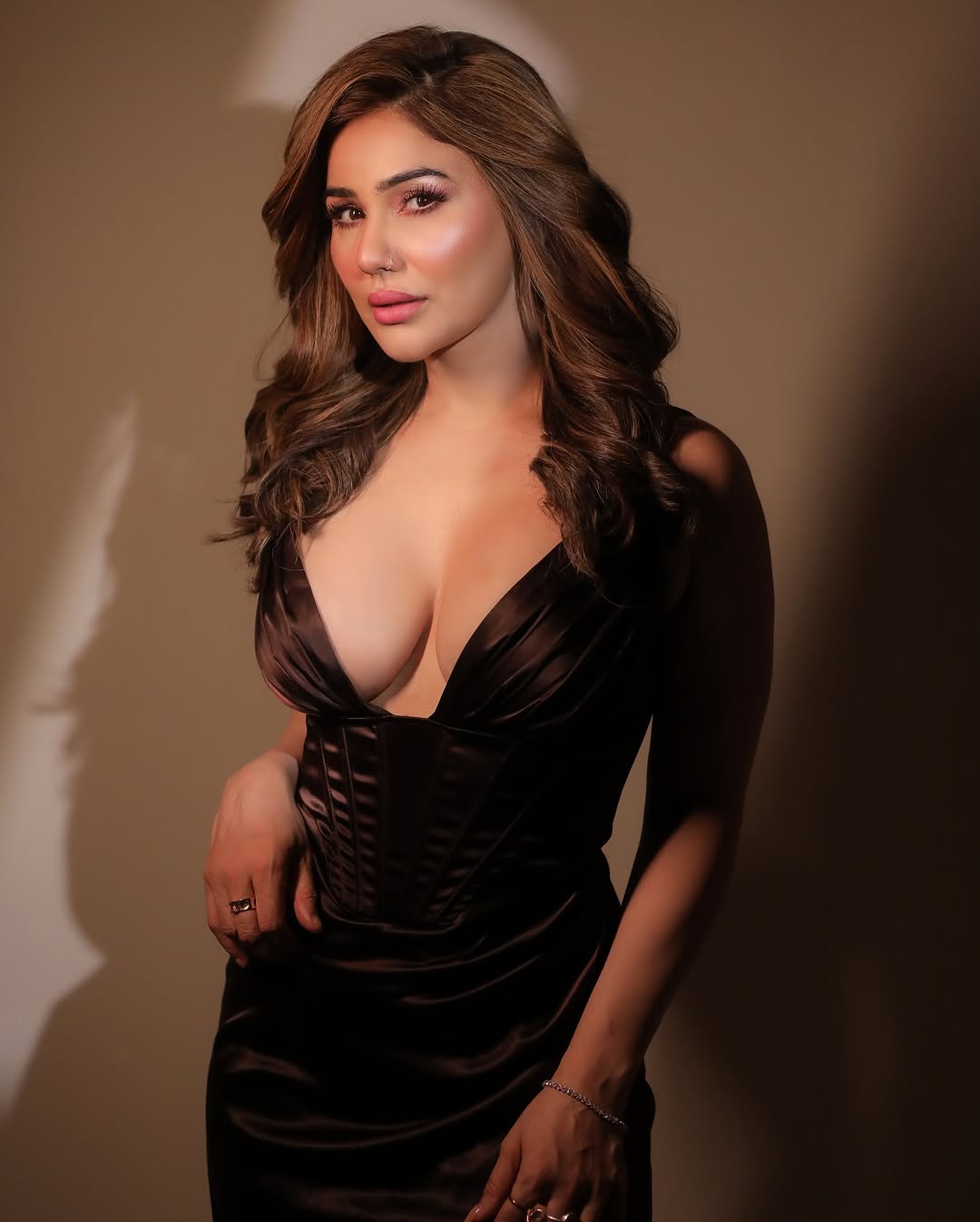 Kangna Sharma, the stunning actress known for her bold persona and captivating screen presence, recently turned heads in a mesmerizing satin dress that perfectly highlighted her curves. The actress, who has been seen in films like Great Grand Masti and Bitch Will Be Back, stepped out in a deep brown satin dress that exuded both elegance and seduction.