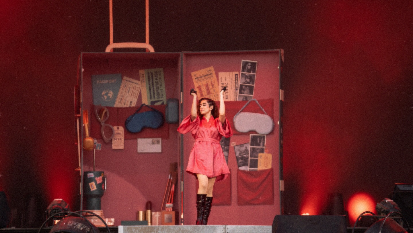 In one of the images, she pairs the ensemble with knee-high black boots, infusing the look with an edgy, rockstar vibe. Complementing the attire, she sports sparkling accessories—a bracelet and a dazzling choker—that enhance her radiant presence under the stage lights. With a poised grip on the microphone, she embodies the essence of a star in command of her craft.