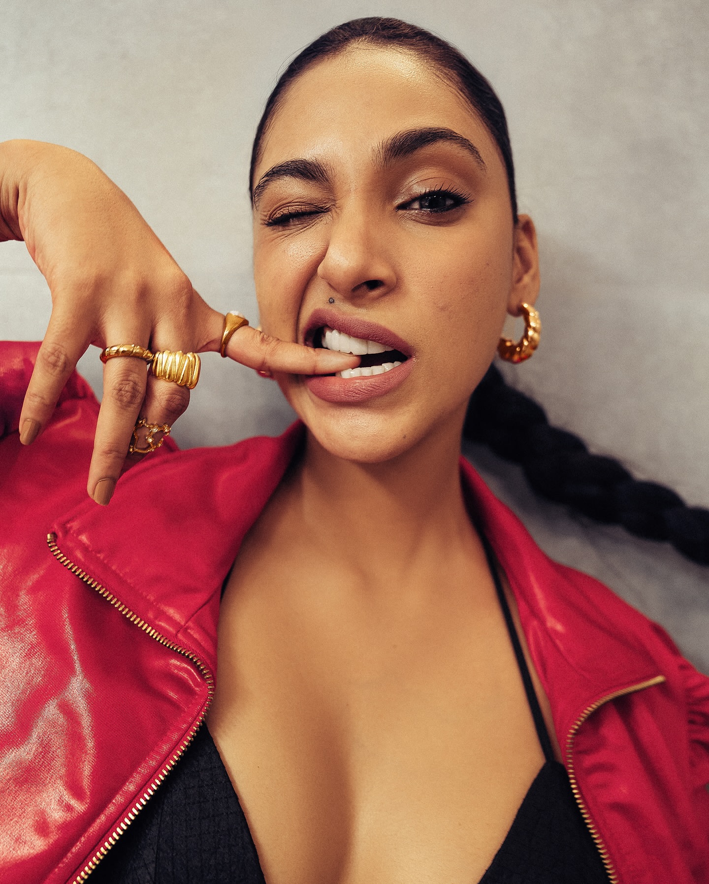 Styling seals the vibe — her sleek braid gives her an athletic edge, the hoop earrings add sparkle, and her smoldering gaze could melt anyone on the spot. Every inch of her radiates bombshell vibes, making it impossible to look away.