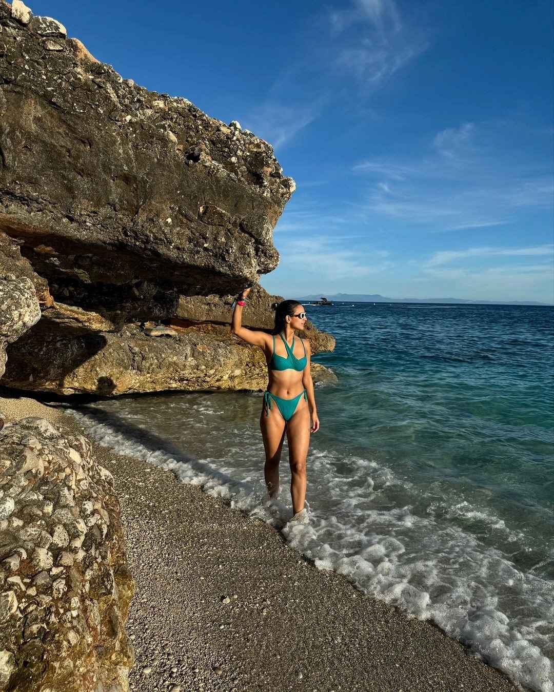 In another look, she switches to a turquoise bikini that brings out her sunlit glow and the crystal blue of the sea behind her. The halter-style top and side-tie bottoms highlight her well-sculpted curves, while the sea breeze plays with her hair, making the whole frame feel like a still from a tropical photoshoot.