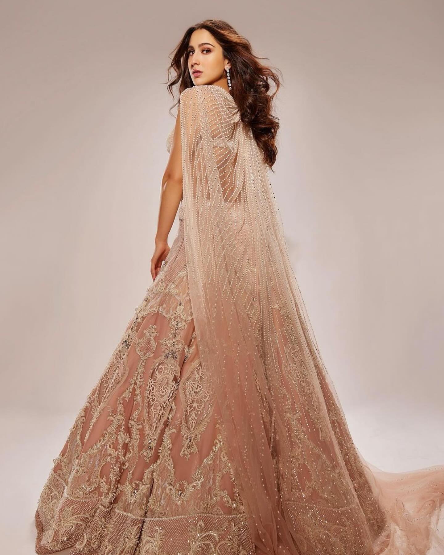 Draped in a blush-pink nude-gold embellished lehenga, Sara exudes both opulence and sensual sophistication. The intricate embroidery, kissed with sequins and zari detailing, weaves a royal story across the flowing fabric. The voluminous skirt cascades gracefully, balancing grandeur with soft feminine charm.