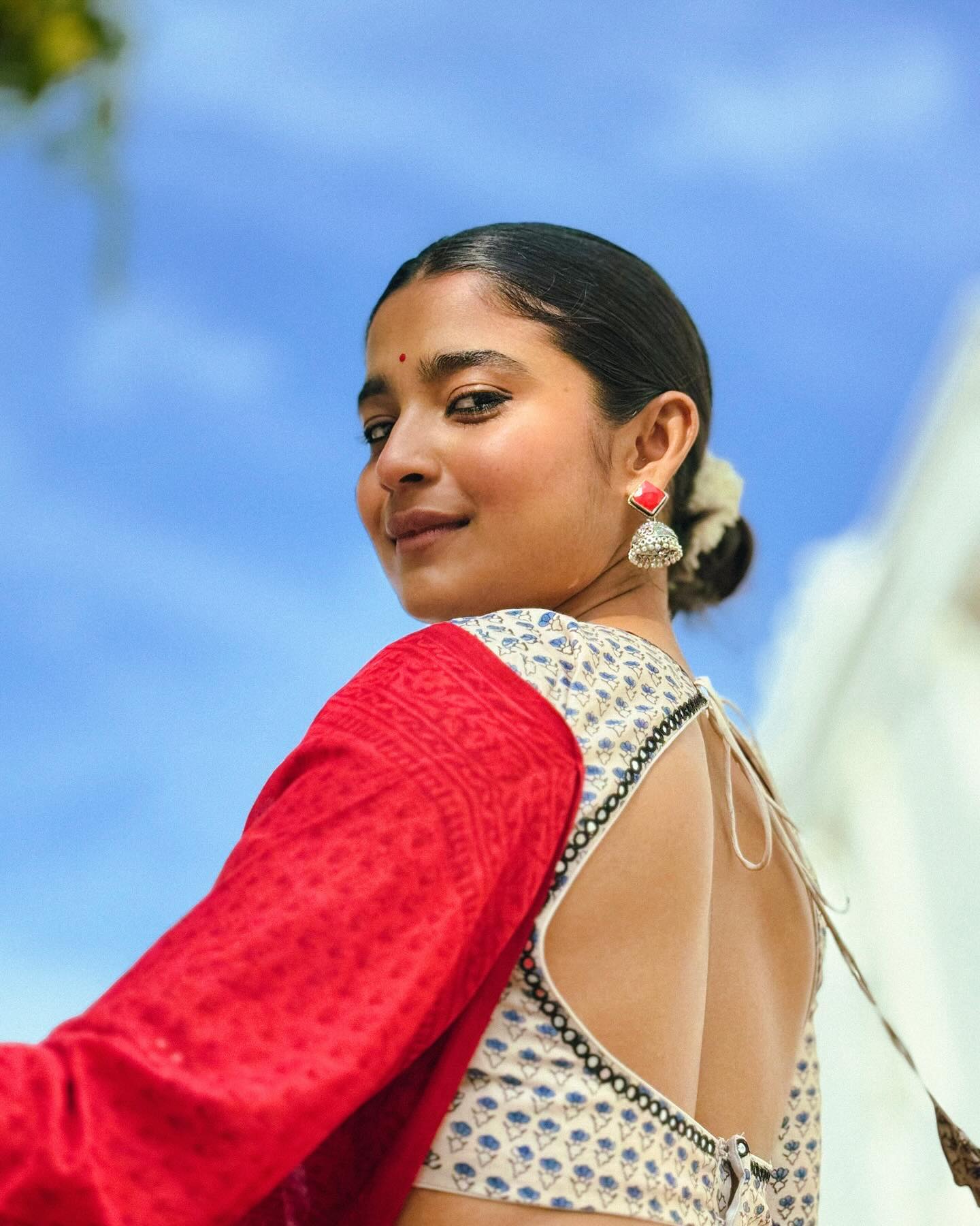 Meenakshi Chaudhary turns heads in red saree, flaunting her hot navel